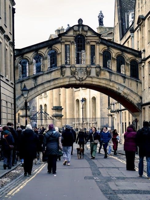 Walking tour maps, particularly in PDF format, are essential for navigating Oxford’s intricate streets. They provide a visual overview of key landmarks, ensuring you don’t miss significant sites like University colleges and museums.